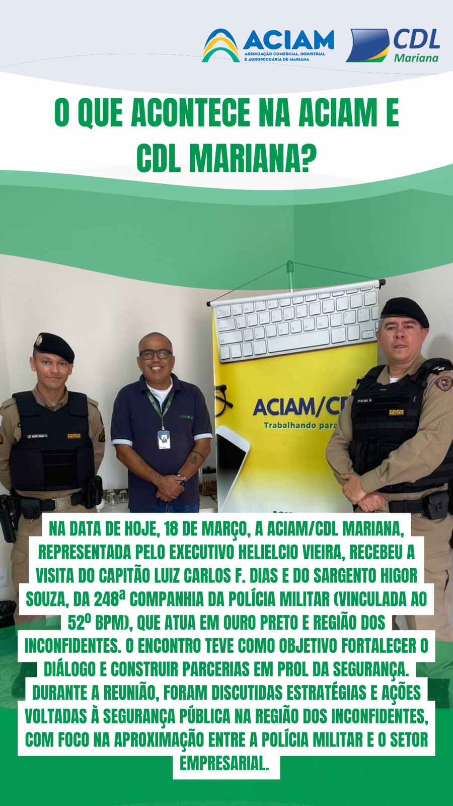 Na data de hoje, 18 de março, a ACIAM/CDL Mariana, representada pelo executivo Helielcio Vieira, recebeu a visita do Capitão Luiz Carlos F. Dias e do Sargento Higor Souza, da 248ª Companhia da Polícia Militar (vinculada ao 52º BPM), que atua em Ouro Preto e Região dos Inconfidentes. O encontro teve como objetivo fortalecer o diálogo e construir parcerias em prol da segurança.