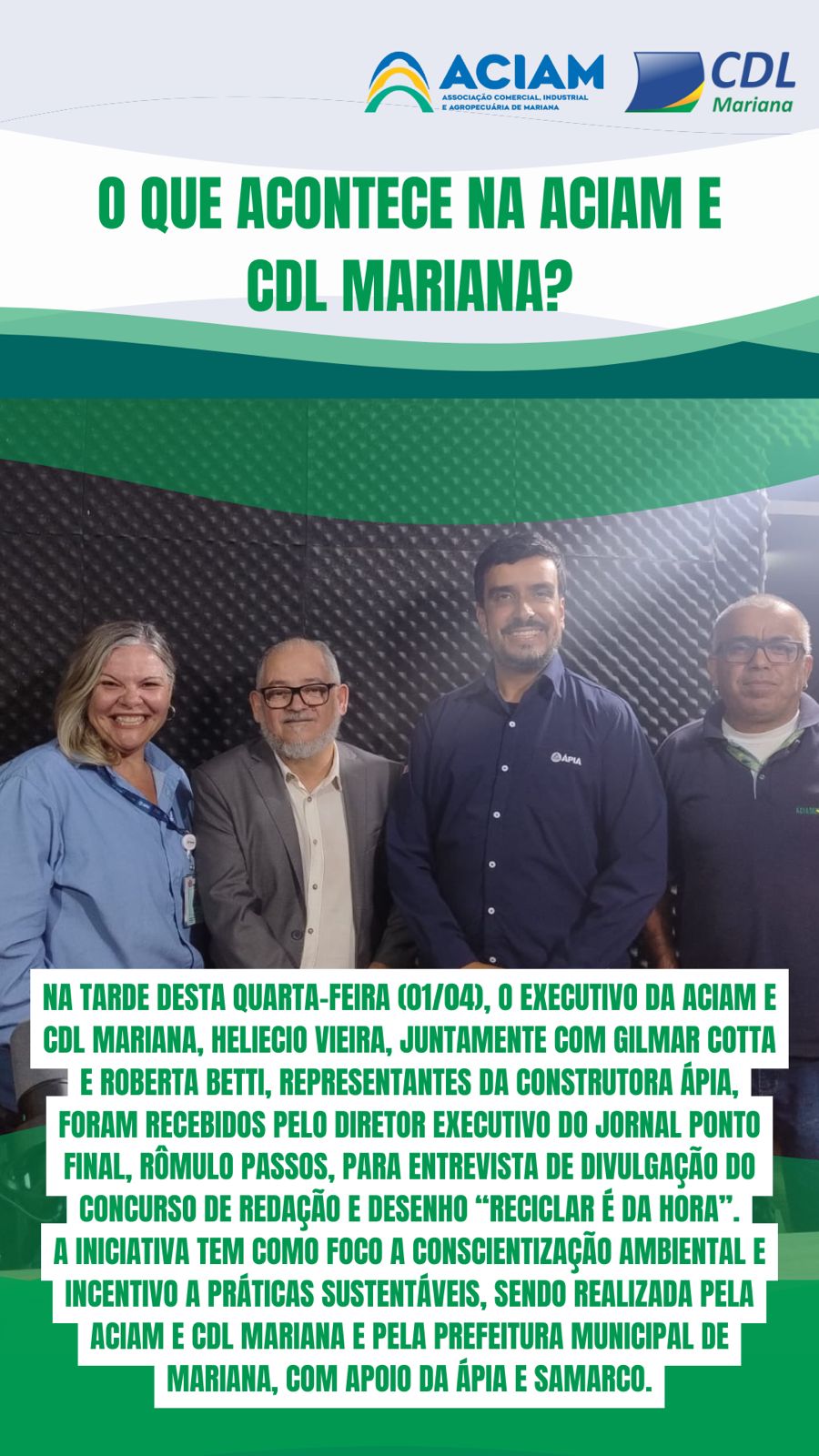 Na tarde desta quarta-feira (01/04), o executivo da ACIAM e CDL Mariana, Heliecio Vieira, juntamente com Gilmar Cotta e Roberta Betti, representantes da Construtora ÁPIA, foram recebidos pelo diretor executivo do Jornal Ponto Final, Rômulo Passos, para entrevista de divulgação do concurso de redação e desenho “Reciclar é da Hora”.