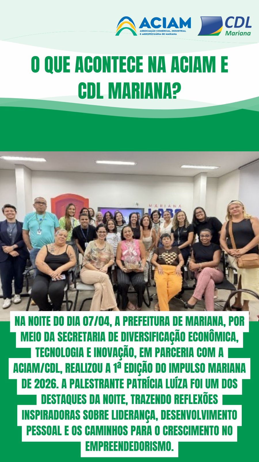 Na noite do dia 07/04, a Prefeitura de Mariana, por meio da Secretaria de Diversificação Econômica, Tecnologia e Inovação, em parceria com a ACIAM/CDL, realizou a 1ª edição do Impulso Mariana de 2026.